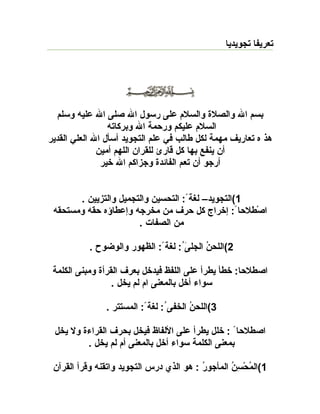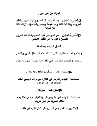 يتناول المستند تعريفات مهمة في علم التجويد، والتي تشمل مصطلحات مثل التدقيق، الحذر، أنواع اللحون، وأحكام الوقف والابتداء. يوضح أيضًا كيفية إخراج الحروف وصفاتها، ويقدم معلومات عن التجويد والتصحيح عند قراءة القرآن. الهدف هو فائدة الطلاب في تعلم التجويد وقراءته بشكل صحيح.