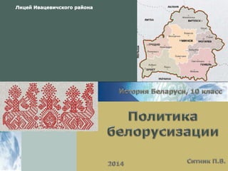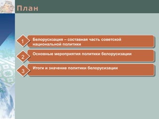 Документ рассматривает политику белорусизации в Белорусской ССР в 1920-е годы, направленную на развитие белорусского языка и культуры, а также на укрепление позиций белорусов в общественно-политической жизни. Основные мероприятия включали создание белорусскоязычных учебных заведений, перевод делопроизводства на белорусский язык и повышение роли представителей коренной нации в государственных органах. Однако, к концу 1920-х годов политика была приостановлена из-за обвинений в национализме и центробежных тенденциях.