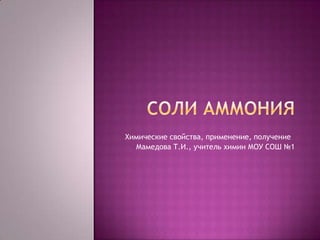 Документ рассматривает химические свойства и применение солей аммония, акцентируя внимание на их растворимости в воде и реакции с щелочами. Также упоминаются типичные применения, такие как использование в хлебопечении, удобрениях и при паянии металлов. В заключение подчеркивается важность азота в жизни и его связь с белками.