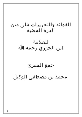 تتناول الوثيقة تحريرات وشرح متن الدرة المضية للعالم ابن الجزري، حيث يسعى المقرئ محمد بن مصطفى الوكيل لجمع المعلومات والقراءات المتعلقة بهذا المتن لتكون متاحة للجميع. توضح الوثيقة طرق القراءة المختلفة والنقاط المهمة في الإخراج والتفاصيل المتعلقة بالقراءات ومواضع المد والقصر، بالإضافة إلى التوجيهات حول إدغام الكلمات والتحذيرات المتعلقة بجوانب معينة من القراءة. تحتوي الوثيقة على تحليلات دقيقة وبعض الفوائد العلمية المستندة إلى أقوال العلماء والمعلمين في هذا المجال.