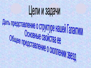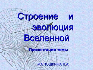 Презентация описывает строение и эволюцию вселенной, фокусируясь на галактиках, их составу и типам, включая эллиптические, спиральные и квазары. Обсуждается центр галактики, ее вращение и расширение метагалактики как важные аспекты космоса. Заключение подчеркивает бесконечный процесс эволюции материи во времени и пространстве.