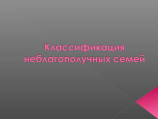 Документ рассматривает различные типы неблагополучных семей и их влияние на развитие детей, описывая, как конфликты, алкоголизм и эмоциональная изоляция взрослых приводят к формированию проблемных моделей поведения у детей. Дети из таких семей часто вырастают с низкой самооценкой, склонностью к химической зависимости и трудностями в общении. В заключение подчеркивается важность эмоциональной связи и адекватного восприятия родителями своих детей для их здорового психоэмоционального развития.