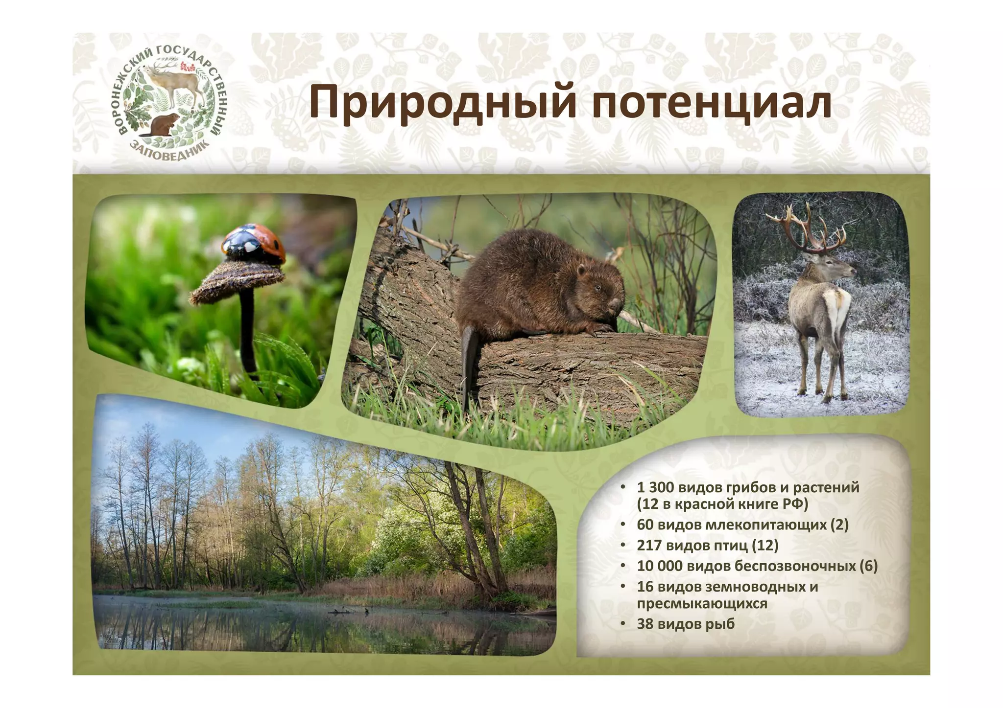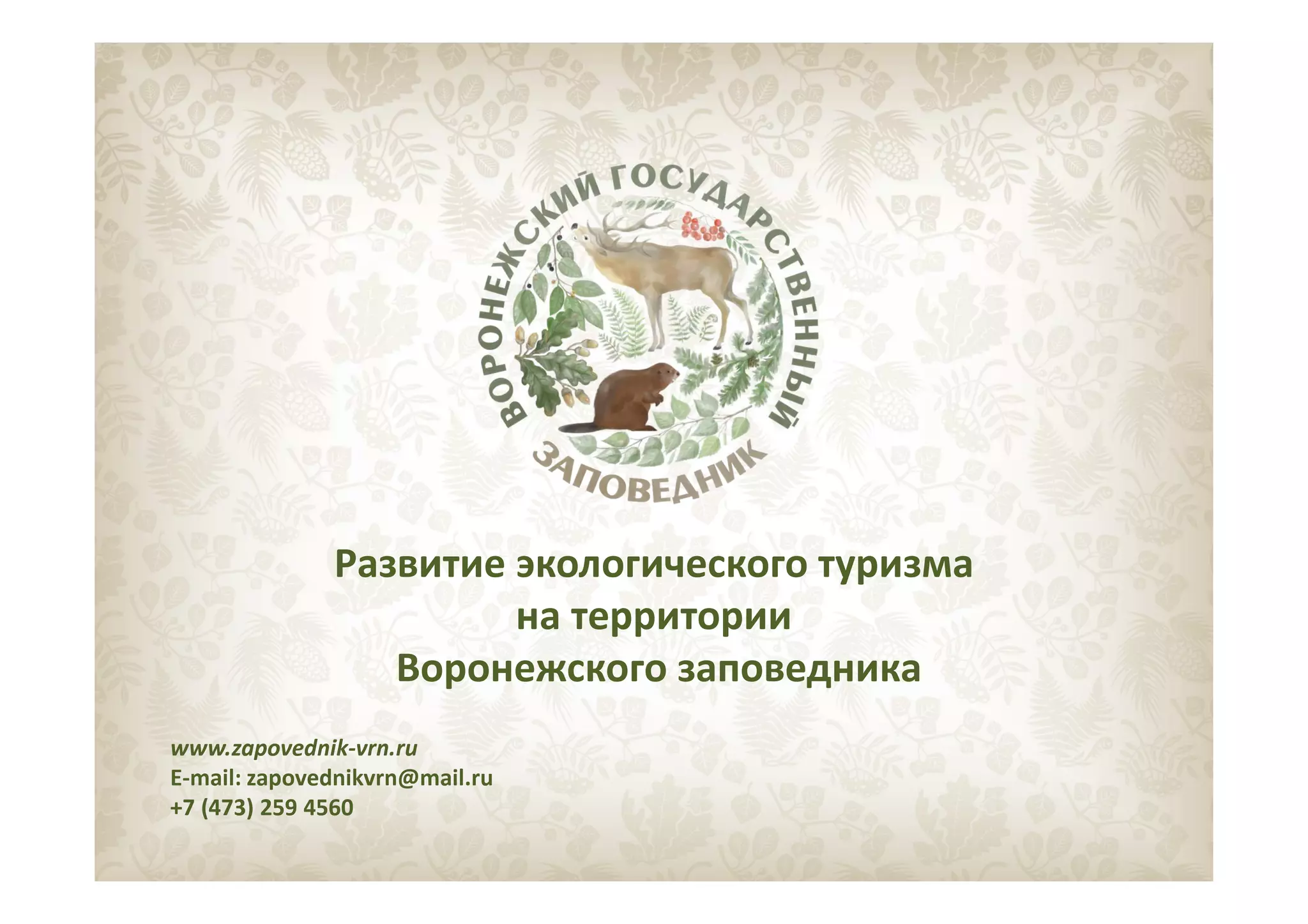 Документ описывает развитие экологического туризма в Воронежском заповеднике, подчеркивая его природный потенциал и уникальное месторасположение. Указаны ключевые природные и историко-культурные объекты, а также планы по благоустройству туристических зон и созданию экологических троп. В этом году заповеднику исполняется 90 лет.