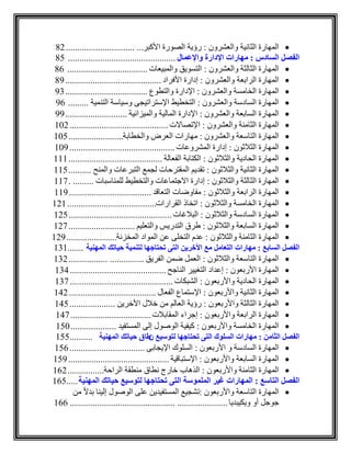 الوثيقة تحتوي على مجموعة من الفصول والمقالات التي تتناول موضوعات متنوعة تتعلق بالمهارات الإدارية والإنتاجية، وتقديم نصائح واستراتيجيات للتطوير الشخصي والمهني. كما تشتمل على تقسيمات تفصيلية لكيفية تحسين الأداء والتفاعل مع الآخرين. تهدف الوثيقة إلى تعزيز الكفاءة الشخصية والمهنية من خلال توفير موارد وأدوات عملية.
