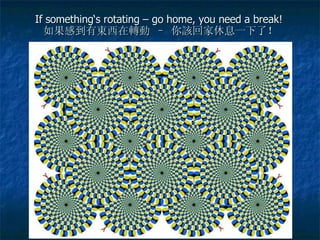 The document discusses how the human brain can be easily deceived through optical illusions and visual phenomena, with tests to gauge mental clarity. It includes exercises to challenge perception, such as identifying dolphins in a picture and focusing on specific images to reveal hidden effects. Finally, it instructs readers on how to see a bright spot and a figure after staring at certain dots, prompting personal interpretation of what is seen.
