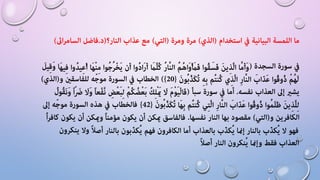 يتطرق الوثيقة إلى تحليل بياني لبعض الآيات القرآنية وأثرها في الفهم؛ حيث يتم التركيز على الفرق بين استخدامات معينة للألفاظ وكيفية تعبير القرآن عن مفاهيم مثل العذاب والأجل. يتضمن النص أيضًا شرحًا لتفسير بعض الآيات وبيان استخدامها اللغوي والنحوي.