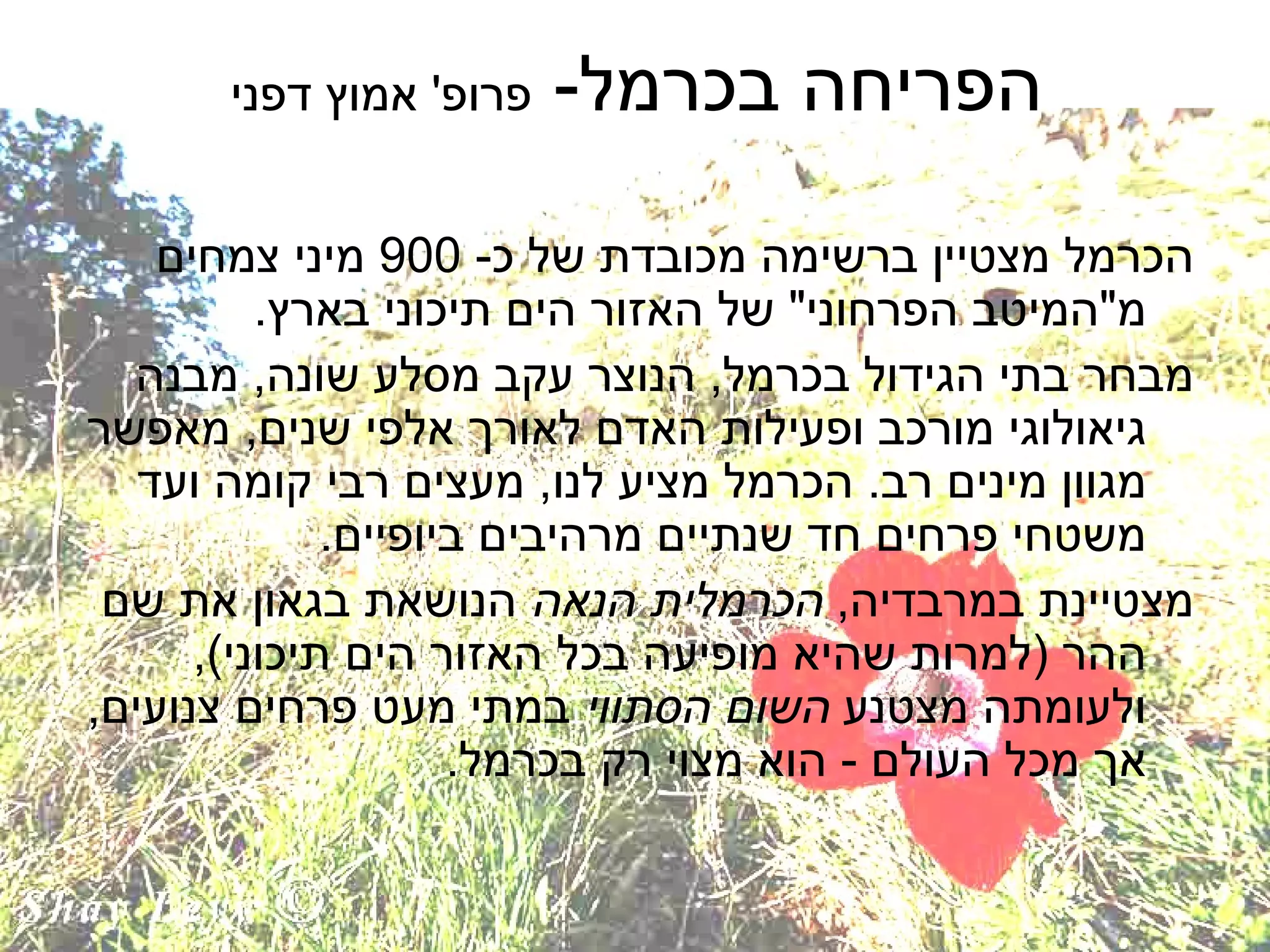 הפריחה בכרמל - פרופ ' אמוץ דפני הכרמל מצטיין ברשימה מכובדת של כ - 900 מיני צמחים מ " המיטב הפרחוני " של האזור הים תיכוני בארץ . מבחר בתי הגידול בכרמל , הנוצר עקב מסלע שונה , מבנה גיאולוגי מורכב ופעילות האדם לאורך אלפי שנים , מאפשר מגוון מינים רב . הכרמל מציע לנו , מעצים רבי קומה ועד משטחי פרחים חד שנתיים מרהיבים ביופיים . מצטיינת במרבדיה , הכרמלית הנאה הנושאת בגאון את שם ההר ( למרות שהיא מופיעה בכל האזור הים תיכוני ), ולעומתה מצטנע השום הסתווי במתי מעט פרחים צנועים , אך מכל העולם - הוא מצוי רק בכרמל .