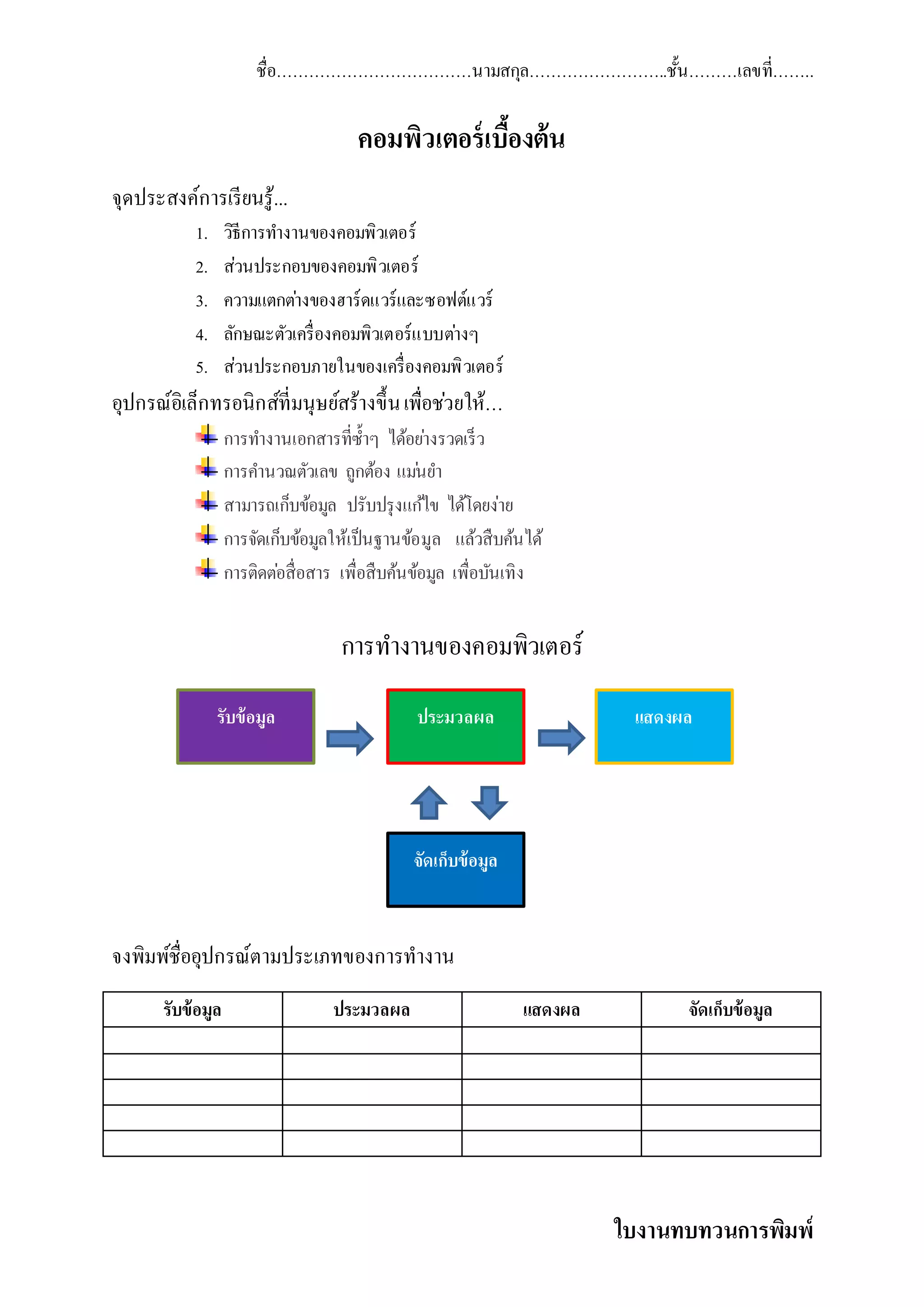 ชื่อ………………………………นามสกุล……………………..ชั้น………เลขที่…….. คอมพิวเตอร์ เบืองต้ น ้ จุดประสงค์การเรี