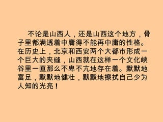 山西是一个文化丰富、景色迷人的地方,拥有许多令人惊叹的自然和人文景观。文档中提到的景点包括雁门关、五台山和大同云冈石窟等,这些都展示了山西的历史和美丽。山西虽然默默无闻,却在中国文化和自然景观中占有重要地位。