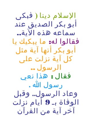 تتناول الوثيقة تفاصيل اللحظات الأخيرة في حياة الرسول محمد صلى الله عليه وسلم، بما في ذلك حجة الوداع وآيات القرآن الأخيرة التي نزلت عليه. تصف الوثيقة مشاعر الصحابة وعائشة أثناء مرضه وآخر خطاب له، حيث خوفهم عليه ودعوته لهم للاهتمام بالصلاة والنساء. تكشف الوثيقة أيضًا عن لحظة وفاته وكيف تلقى الصحابة الخبر، معبرين عن حزنهم الشديد لفقدانه.