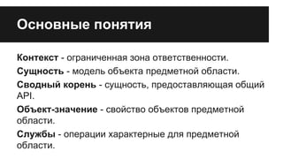 Документ описывает основные концепции доменной модели для системы управления складом, включая сущности, объекты-значения и корни агрегации. Основные задачи системы включают упорядочение приема товаров, организацию заявок на выдачу и оповещение менеджмента о нехватке товаров. Также приведены примеры кода, иллюстрирующие реализацию различных компонентов системы и взаимодействие между ними.