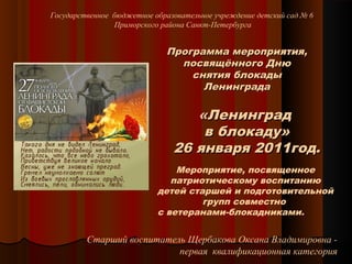 Документ представляет программу мероприятия, посвященного Дню снятия блокады Ленинграда, организованного детским садом № 6 Приморского района Санкт-Петербурга. Основные цели мероприятия включают патриотическое воспитание детей, признание героизма защитников города и развитие интереса к историческому наследию. Программа включает музыкальные номера, слайд-шоу и вручение памятных сувениров ветеранам-блокадникам.