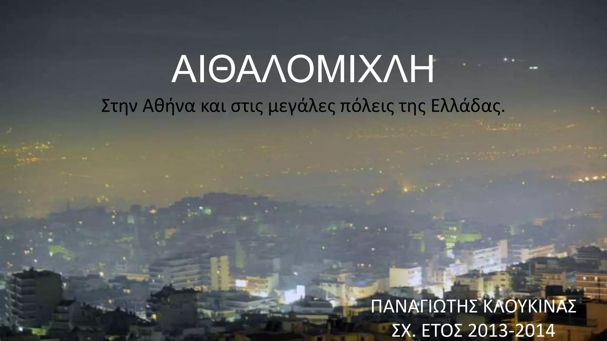 Η παρουσίαση αυτή αναφέρεται στην αιθαλομίχλη και έγινε στα πλαίσια του προγράμματος Υποστήριξης Πρωτοβουλιών Μαθητών- Εντός, εκτός και επί τα αυτά: Μαθητές εν δράσει! (Σεπτέμβριος-Νοέμβριος 2013) της Γενικής Γραμματείας Νέας Γενιάς.