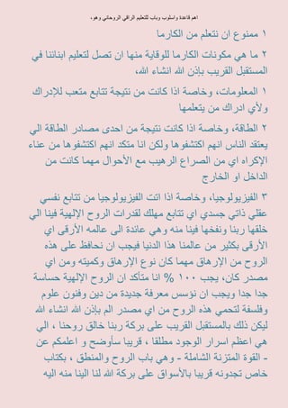 تناقش الوثيقة أهمية تعلم الوعي الروحي وتجنب الكارما، وتوضح مكونات الوقاية منها مثل المعلومات والطاقة والفسيولوجيا. يشدد على ضرورة الحفاظ على الروح الإلهية من الإرهاق والتأسيس لمعرفة جديدة لحمايتها. الوثيقة تعد بإصدار كتاب قريب يتناول القوة المتزنة الشاملة.