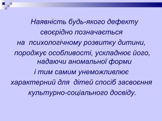 Н.В.Михайлюченко. Психологічна допомога в розвитку дітей із вадами слуху в центрі «СУВАГ» 1. 2. Наявність будь-якого дефекту