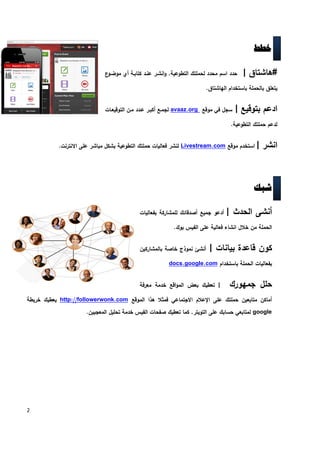 يستعرض الوثيقة استخدام أدوات الإعلام الاجتماعي في العمل التطوعي، مع التركيز على مواقع مثل تويتر وفيسبوك ويتيوب لتوسيع الحملات وجذب الانتباه. تضمن الوثيقة استراتيجيات لتحديد احتياجات الفرق التطوعية ومقاييس النجاح لتلك الحملات. كما تتطرق إلى تكتيكات لجمع التبرعات والتعامل مع المحتوى لجذب المتابعين.