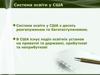 Система освіти у США є досить розгалуженою та багатоступеневою. В США існує поділ освітніх установ на приватні та державні, прибуткові та неприбуткові . Незважаючи на децентралізацію та поділ освітніх установ, зміст навчання залишається практично незмінним.