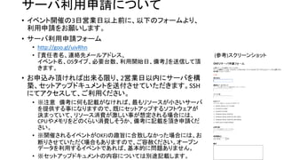サーバ利用申請について • イベント開催の3日営業日以上前に、以下のフォームより、 利用申請をお願いします。 • サーバ利用申請フォーム •