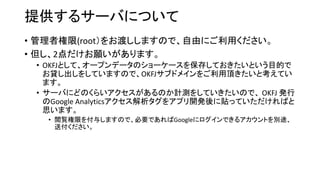 OKFJとして、オープンデータのショーケースを保存しておきたいという目的で お貸し出しをしていますので、OKFJサブドメインをご利用頂きたいと考えてい ます。 • サーバにどのくらいアクセスがあるのか計測をしていきたいので、 OKFJ 発行 のGoogle Analyticsアクセス解析タグをアプリ開発後に貼っていただければと 思います。 • 閲覧権限を付与しますので、必要であればGoogleにログインできるアカウントを別途、 送付ください。