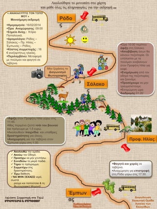 ζηο χάρηη και μάθε όλες ηις πληροθορίες για ηην εκδρομή … « ΑΝΑΚΑΛΥΠΤΩ ΤΟΝ ΤΟΠΟ ΜΟΥ » Μονοήμεπη εκδπομή Ημεπομηνία: 16/02/2014 Ώπα Ανασώπηζηρ: 09:00 Σημείο Ανασ.: Κηίξην Παπαινπθά. Δπομολόγιο: Ρόδνο – άιαθνο – Πξ. Ηιίαο – Έκπωλαο – Ρόδνο. Κόζηορ ζςμμεηοσήρ : 16 € αλεμαξηήηωο ειηθίαο. Πεπιλαμβάνει: Μεηαθνξά κε πνύικαλ θαη θαγεηό ζε ηαβέξλα. Μελ μεράζεηο ην Διαγωνιζμό Φωηογπαθίαρ Ώξα 10:00 πεξίπνπ άθιξη ζηε άιαθν. Αποβίβαζη όζωλ ζα θάλνπλ πεδνπνξία. Οη ππόινηπνη κε ηα πνύικαλ αλεβαίλνπλ ζηνλ Πξνθήηε Ηιία γηα θαθέ. Ενημέπωζη από ηνλ νδεγό ηεο πεδνπνξίαο θαη μεθηλάκε. Πποζέσοςμε λα κελ ηξαπκαηηζηνύκε. Εθηηκώκελε ώξα διαδπομήρ 01:20΄ Άθιξη ζηνλ Πξνθήηε Ηιία γύξω ζηηο 11:45. Μαο πεξηκέλεη δεζηό ηζάι ηος βοςνού θαη πξόγεπκα κε 1,5 επξώ. Αθνινπζνύλ παισνίδια θαη ππαίζξηεο δπαζηηπιόηηηερ γηα όινπο. Ανασώπηζη γηα ηελ ηαβέξλα ζηνλ Έκπωλα γύξω ζηε 1:30. Ακολοςθώ ηελ νκάδα. Ακούω ηνλ Οδεγό. Πποζέσω λα κελ ρηππήζω. Σςνοδεύω ηα κηθξά παηδηά. Τηπώ ην πξόγξακκα. Σςμμεηέσω ζηηο δξαζηεξηόηεηεο. Έσω δηάζεζε. ΝΑ ΜΗΝ ΞΕΦΑΣΩ λεξό, ζωζηά ξνύρα θαη παπνύηζηα & ηε Φωηνγξαθηθή Μεραλή! Δηλώστε Συμμετοχή στα Τηλ.: 6943473343 & 6974001617 Φαγηηό και σοπόρ ζε ηαβέξλα. Αλαρώξεζε γηα επιζηποθή ζηε Ρόδν γύξω ζηηο 17:30.