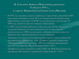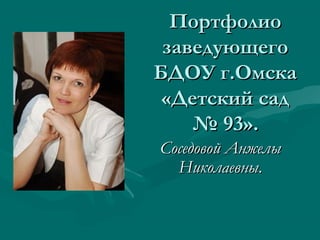 Документ представляет портфолио заведующей детским садом № 93 в Омске, Анжелы Николаевны Соседовой, описывающее ее образование, карьерный путь и достижения. Она начала свою карьеру в детском саду с младшего воспитателя, а затем стала заведующей, активно участвуя в профессиональном развитии и общественной жизни. В документе также подчеркивается роль коллектива детского сада в конкурсах, мероприятиях и повышении качества образовательного процесса.