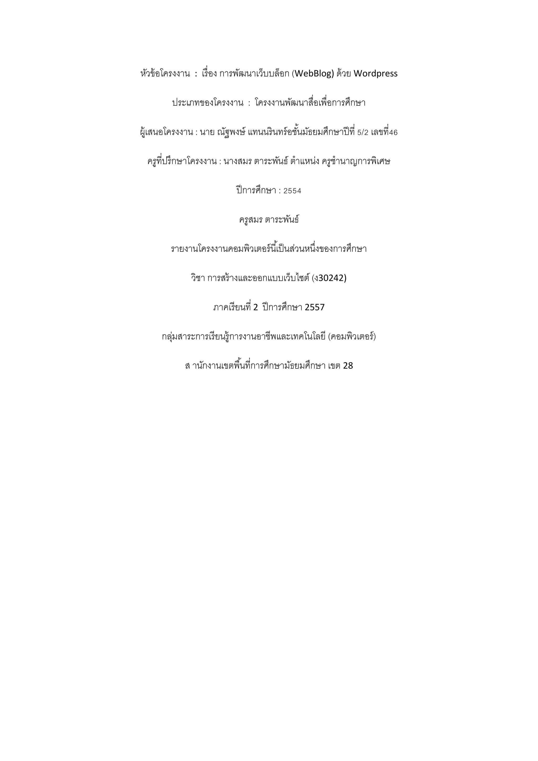 เรื่ อง การพัฒนาเว็บบล็อก (WebBlog) ด้ วย Wordpress ประเภทของโครงงาน : โครงงานพัฒนาสือเพื่อการศึกษา ่ ผู้เสนอโครงงาน : นาย ณัฐพงษ์ แทนนริ นทร์ อชันมัธยมศึกษาปี ที่ 5/2 เลขที่46 ้ ครูที่ปรึกษาโครงงาน : นางสมร ตาระพันธ์ ตําแหน่ง ครูชํานาญการพิเศษ ปี การศึกษา : 2554 ครูสมร ตาระพันธ์ รายงานโครงงานคอมพิวเตอร์ นี ้เป็ นส่วนหนึงของการศึกษา ่ วิชา การสร้ างและออกแบบเว็บไซต์ (ง30242) ภาคเรี ยนที่ 2 ปี การศึกษา 2557 กลุมสาระการเรี ยนรู้การงานอาชีพและเทคโนโลยี (คอมพิวเตอร์ ) ่ ส านักงานเขตพื ้นที่การศึกษามัธยมศึกษา เขต 28