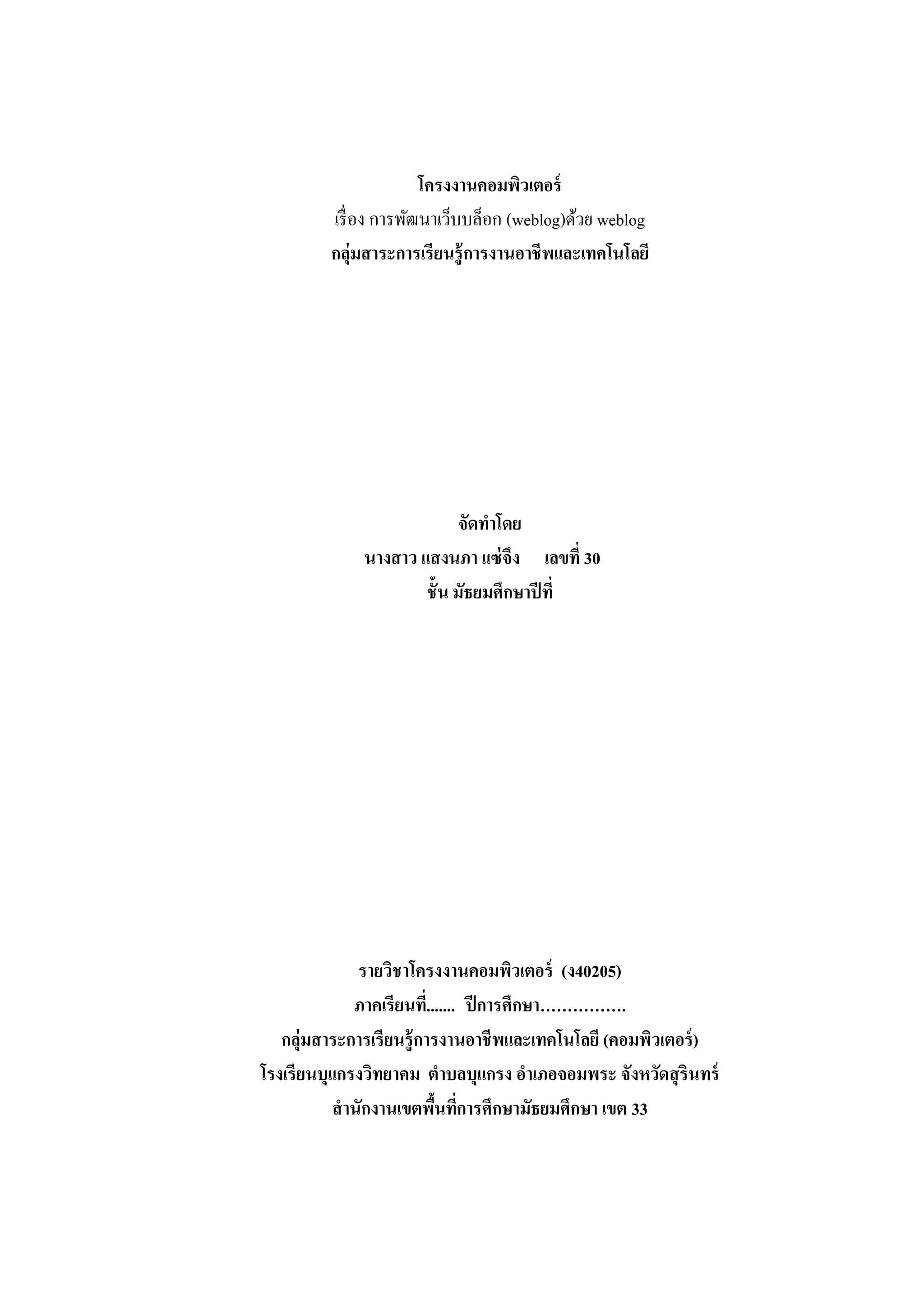 (weblog)ด้วย weblog กลุ่มสาระการเรียนรู้ การงานอาชี พและเทคโนโลยี จัดทาโดย นางสาว แสงนภา แซ่ จึง เลขที่ 30 ชั้น มัธยมศึกษาปี ที่ รายวิชาโครงงานคอมพิวเตอร์ (ง40205) ภาคเรียนที.่ ...... ปี การศึกษา……………. กลุ่มสาระการเรียนรู้ การงานอาชี พและเทคโนโลยี (คอมพิวเตอร์ ) โรงเรียนบุแกรงวิทยาคม ตาบลบุแกรง อาเภอจอมพระ จังหวัดสุ รินทร์ สานักงานเขตพืนทีการศึกษามัธยมศึกษา เขต 33 ้ ่