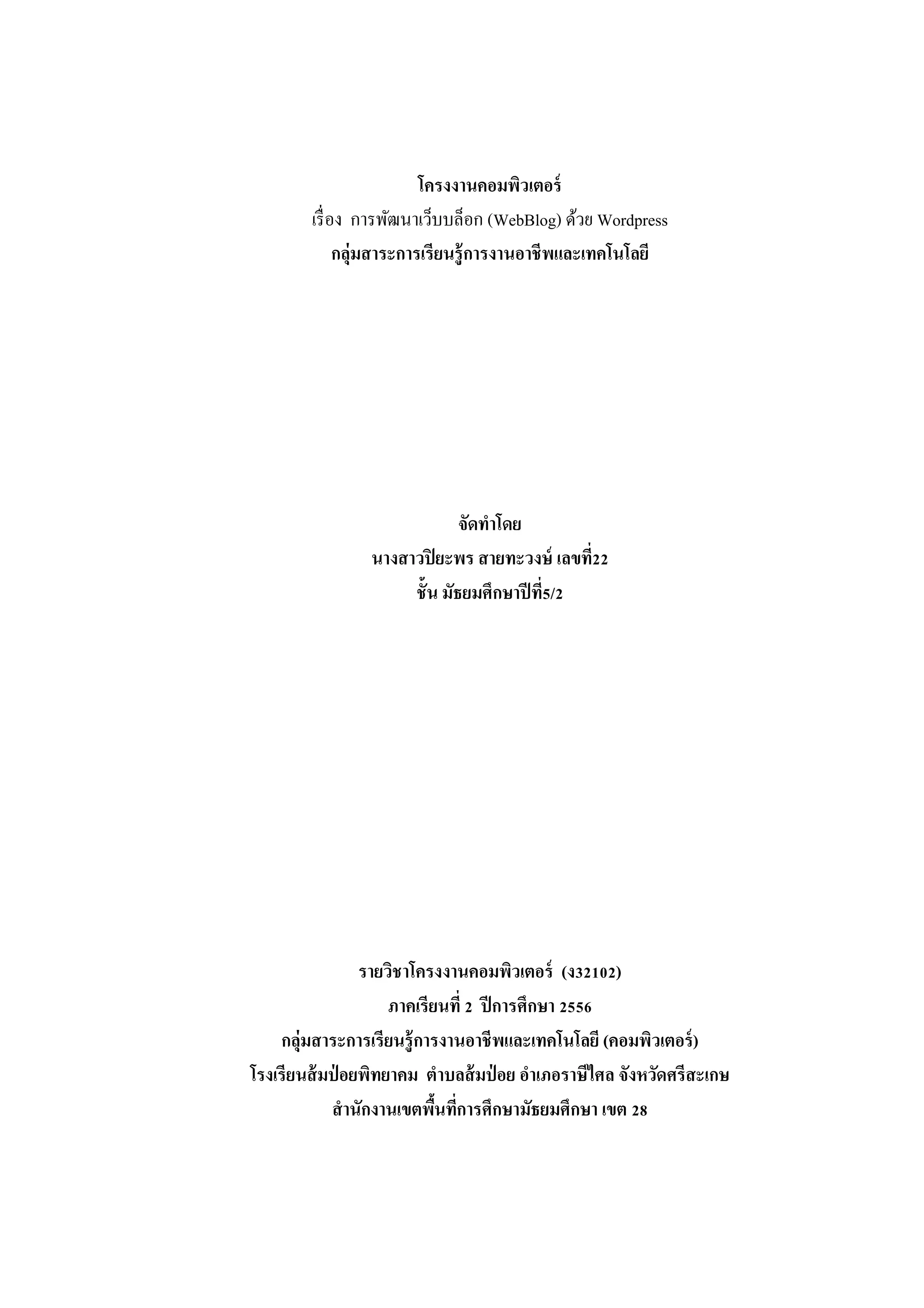 (WebBlog) ด้วย Wordpress กลุ่มสาระการเรียนรู้ การงานอาชี พและเทคโนโลยี จัดทาโดย นางสาวปิ ยะพร สายทะวงษ์ เลขที22 ่ ชั้น มัธยมศึกษาปี ที5/2 ่ รายวิชาโครงงานคอมพิวเตอร์ (ง32102) ภาคเรียนที่ 2 ปี การศึกษา 2556 กลุ่มสาระการเรียนรู้ การงานอาชี พและเทคโนโลยี (คอมพิวเตอร์ ) โรงเรียนส้ มป่ อยพิทยาคม ตาบลส้ มป่ อย อาเภอราษีไศล จังหวัดศรีสะเกษ สานักงานเขตพืนทีการศึกษามัธยมศึกษา เขต 28 ้ ่