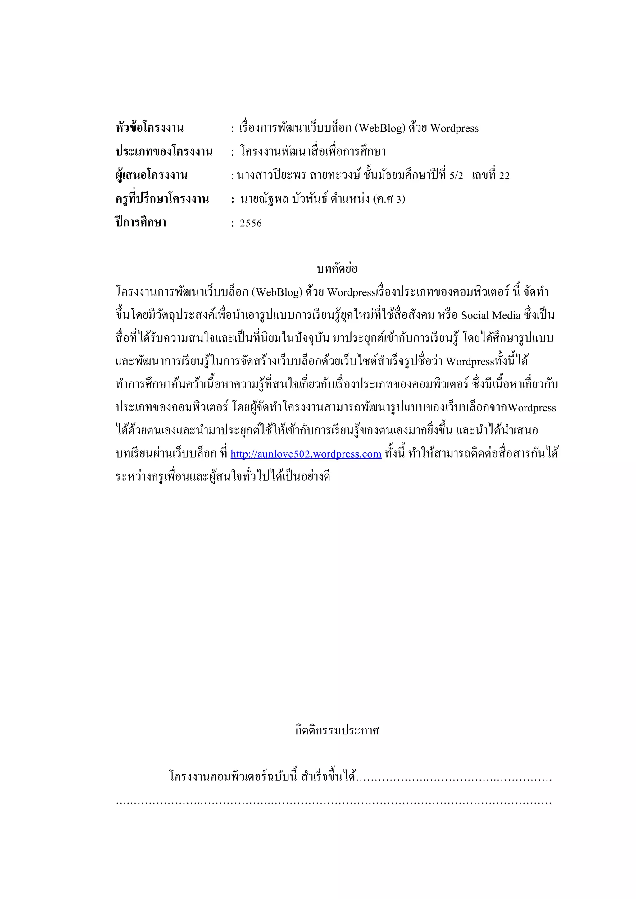 การศึกษา : เรื่ องการพัฒนาเว็บบล็อก (WebBlog) ด้วย Wordpress : โครงงานพัฒนาสื่ อเพื่อการศึกษา : นางสาวปิ ยะพร สายทะวงษ์ ชั้นมัธยมศึกษาปี ที่ 5/2 เลขที่ 22 : นายณัฐพล บัวพันธ์ ตาแหน่ง (ค.ศ 3) : 2556 บทคัดย่อ โครงงานการพัฒนาเว็บบล็อก (WebBlog) ด้วย Wordpressเรื่ องประเภทของคอมพิวเตอร์ นี้ จัดทา ขึ้นโดยมีวตถุประสงค์เพื่อนาเอารู ปแบบการเรี ยนรู ้ยคใหม่ที่ใช้สื่อสังคม หรื อ Social Media ซึ่งเป็ น ั ุ สื่ อที่ได้รับความสนใจและเป็ นที่นิยมในปั จจุบน มาประยุกต์เข้ากับการเรี ยนรู ้ โดยได้ศึกษารู ปแบบ ั และพัฒนาการเรี ยนรู ้ในการจัดสร้างเว็บบล็อกด้วยเว็บไซต์สาเร็ จรู ปชื่ อว่า Wordpressทั้ งนี้ได้ ทาการศึกษาค้นคว้าเนื้ อหาความรู ้ที่สนใจเกี่ยวกับเรื่ องประเภทของคอมพิวเตอร์ ซึ่ งมีเนื้อหาเกี่ยวกับ ประเภทของคอมพิวเตอร์ โดยผูจดทาโครงงานสามารถพัฒนารู ปแบบของเว็บบล็อกจากWordpress ้ั ได้ดวยตนเองและนามาประยุกต์ใช้ให้เข้ากับการเรี ยนรู ้ของตนเองมากยิงขึ้น และนาได้นาเสนอ ้ ่ บทเรี ยนผ่านเว็บบล็อก ที่ http://aunlove502.wordpress.com ทั้งนี้ ทาให้สามารถติดต่อสื่ อสารกันได้ ระหว่างครู เพื่อนและผูสนใจทัวไปได้เป็ นอย่างดี ้ ่ กิตติกรรมประกาศ โครงงานคอมพิวเตอร์ ฉบับนี้ สาเร็ จขึ้นได้……………….……………….…………… ….……………….……………….…………………………………………………………………
