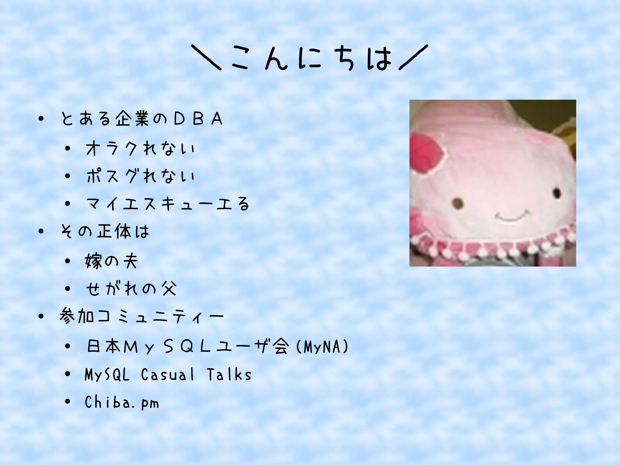 \こんにちは/ ● とある企業のDBA オラクれない ● ポスグれない ● マイエスキューエる その正体は ● ● 嫁の夫 ● せがれの父 参加コミュニティー ● ● ● ● ● 日本MySQLユーザ会 (MyNA) MySQL Casual