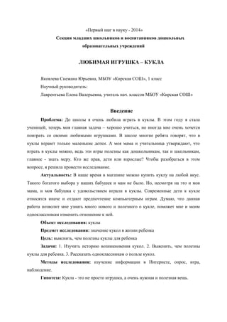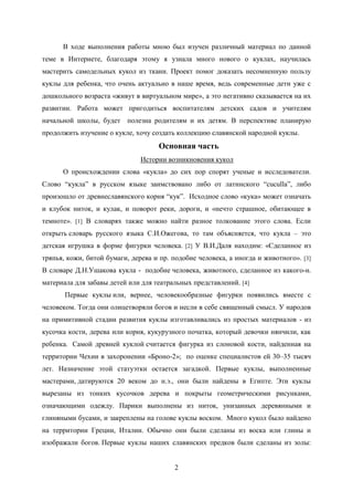 Документ описывает исследование, проведенное школьницей о значении кукол в жизни детей, их полезности и изменении отношения к ним среди сверстников. В ходе работы была изучена история возникновения кукол, проведен опрос одноклассников и разработаны мастер-классы по изготовлению самодельных кукол. Исследование подтвердило гипотезу о том, что куклы являются не только игрушками, но и важными объектами для обучения и развития детей.