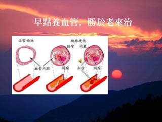 文档强调提前保养血管的重要性,指出人们常在年轻时忽视血管健康,导致疾病风险增加,并提供了一些血管保健的方法,如饮食调整和适度运动。提供的建议包括多吃富含鱼油和叶酸的食物、保持规律作息、避免熬夜和吸烟,以及进行定期的血管体操。后面还列出了多种食物和生活方式,以帮助保持血管健康,降低心脑血管疾病的风险。