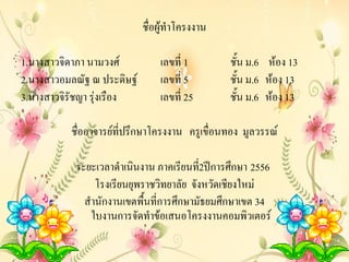 ประดิษฐ์ 3.นางสาวจิรัชญา รุ่งเรือง เลขที่ 1 เลขที่ 5 เลขที่ 25 ชั้น ม.6 ห้อง 13 ชั้น ม.6 ห้อง 13 ชั้น ม.6 ห้อง 13 ชื่ออาจารย์ที่ปรึกษาโครงงาน ครูเขื่อนทอง มูลวรรณ์ ระยะเวลาดาเนินงาน ภาคเรียนที2ปีการศึกษา 2556 ่ โรงเรียนยุพราชวิทยาลัย จังหวัดเชียงใหม่ สานักงานเขตพื้นที่การศึกษามัธยมศึกษาเขต 34 ใบงานการจัดทาข้อเสนอโครงงานคอมพิวเตอร์