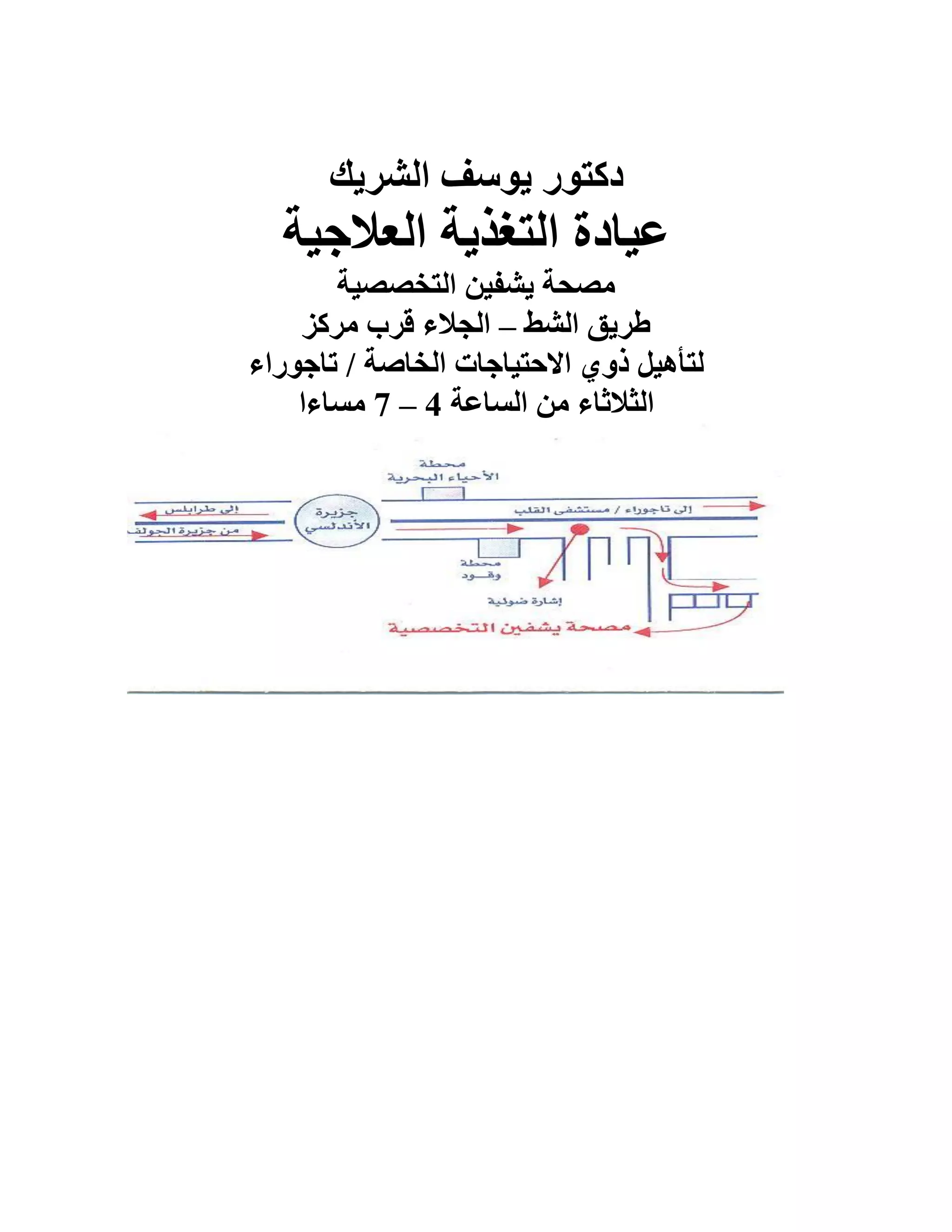 تقدم عيادة التغذية العلاجية تحت إشراف دكتور يوسف الشريك خدماتها في مصحة يشفين التخصصية. تعمل العيادة أيام الثلاثاء من الساعة 4 إلى 7 مساءً. تقع العيادة بالقرب من مركز تأهيل ذوي الاحتياجات الخاصة في تاجوراء.
