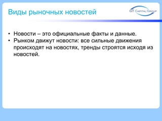Доклад Александра Хурко освещает влияние рыночных новостей на торговлю, классифицируя их на прогнозируемые и непрогнозируемые. Прогнозируемые новости, такие как макроэкономическая статистика и корпоративные отчеты, играют важную роль в определении волатильности и отборе акций, тогда как непрогнозируемые события, например, стихийные бедствия и теракты, часто вызывают эмоциональные и резкие реакции рынка. Трейдеры могут использовать различные интернет-ресурсы и новостные инструменты для отслеживания и анализа событий, влияющих на рынок.