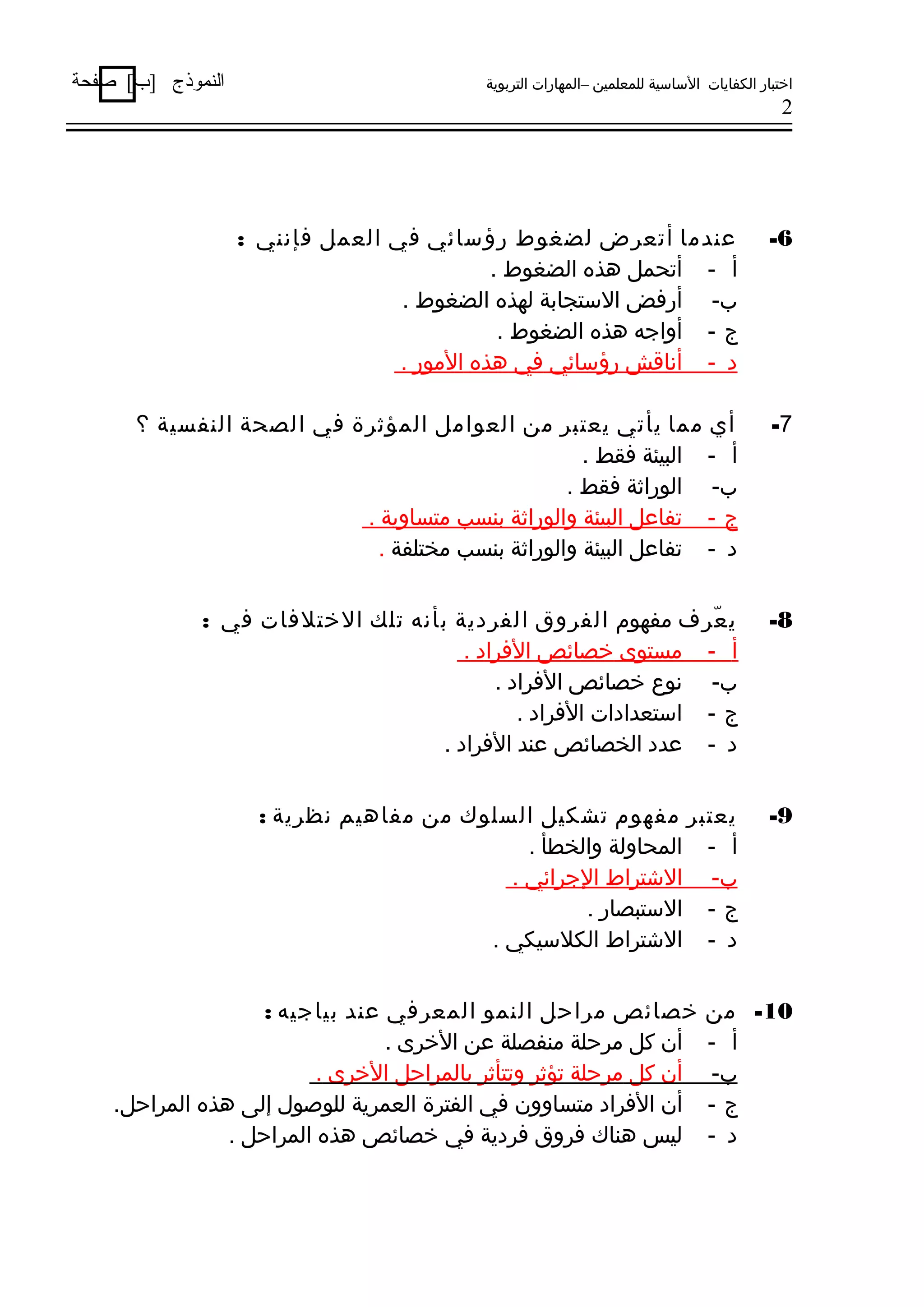 يتناول المستند اختبار الكفايات الأساسية للمعلمين في المهارات التربوية، والذي يتضمن مجموعة من الأسئلة المتعلقة بأهداف التربية، مفاهيم التعلم، وطرق التدريس. يشمل المحتوى المواضيع المتعلقة بالصحة النفسية، الفروق الفردية، استراتيجيات التقويم، وعوامل تحقيق التعلم الذاتي. يُعتبر هذا الاختبار أداة لتقييم كفاءة المعلمين وقدرتهم على تطبيق المعارف والمهارات التربوية في الميدان.
