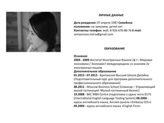 Документ содержит резюме кандидата с личными данными, образованием и опытом работы. Кандидат имеет степень в области международной экономики, дополнительное образование в сфере дизайна и гостиничного бизнеса, а также опыт работы в маркетинге и управлении гостиничной сетью. Основные навыки включают разработку стратегий продвижения, управление проектами и взаимодействие с клиентами.
