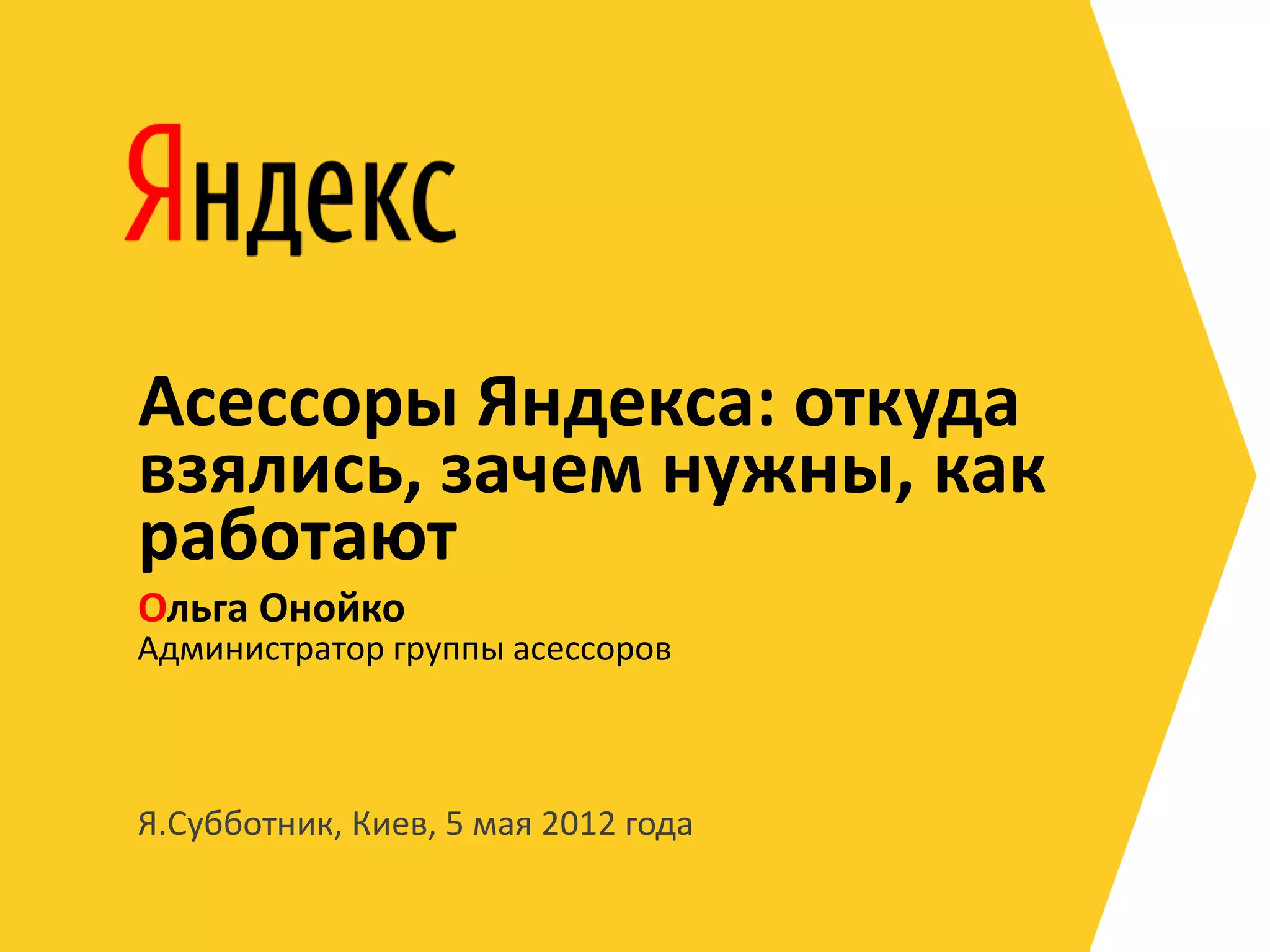 Документ обсуждает роль и функции асессоров Яндекса, их влияние на качество поисковых систем и опыт работы с ними. В нем содержится информация о развитии системы асессоров с 2006 года, а также затрагиваются актуальные вопросы в контексте поиска и оценки информации. Ольга Онойко, администратор группы асессоров, является автором документа.