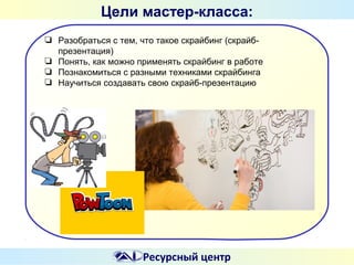Мастер-класс по скрайбингу, проведенный Еленой Владимировной Сиркиз, нацелён на изучение техники создания скрайб-презентаций, включая применение различных методов, подбор оборудования и материалов, а также процесс создания и монтажа видео. Участники научатся создавать команды, разрабатывать сценарии, рисовать и озвучивать свои презентации. Документ подробно описывает преимущества и недостатки скрайбинга, а также предоставляет советы по организации процесса.