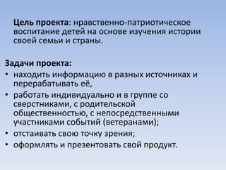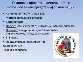 Проект «Мы знаем! Мы помним! Мы гордимся!» направлен на нравственно-патриотическое воспитание учеников 3-4 классов через изучение истории их семей и страны. Учащиеся работают над проектами, связанными с военной историей и ветеранами, и получают возможность выразить свою гордость за предков. Родители и учитель активно участвуют в процессе, что способствует развитию у детей интереса к познанию и общению.