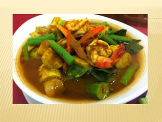 เป็ นอาหารทีประกอบด้วยรสเข้มข้นมีเครืองปรุงหลายอย่างรสชาติอาหารแต่ละ ่ ่ อย่างมีรสเฉพาะตัวการใช้เครืองปรุงรสต่างๆก็ไม่เหมือนกันผู ประกอบอาหารไทยต้อง ่ ้ ศึกษาจากตาราอาหารไทยและผู เ้ ชียวชาญการทาอาหารไทยให้อร่อยต้องใช้ความชานาญ ่ และประสบการณ์ตลอดจนกรรมวิธใี นการประกอบอาหารไทยผู ทาจะต้องพิถพถน ประณีต ้ ี ิั มีขนตอนเพือให้อาหารน่ารับประทาน อาหารไทยขึนชือได้ว่ามีประวัตมาช้านาน ผู คนส่วน ั้ ่ ้ ่ ิ ้ ใหญ่ทงในและต่างประเทศต่างนิยมชมชอบในอาหารไทยกันมากมาย โดยเฉพาะชือเสียงใน ั้ ่ ด้านความเข้มข้นและจัดจ้านของรสอาหารทีตดปากติดใจผู คนมานับศตวรรษ ่ ิ ้