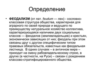 Документ рассматривает условия существования городского и сельского населения в эпоху феодализма на древней Руси, включая определение феодализма и процессы колонизации. Описывается демографическая динамика, влияние на неё нашествий и войны, а также социальная структура, сформированная двумя основными классами: феодалами и крестьянами. Итоги феодальной раздробленности показали распад Руси на княжества при сохранении единства народа и культуры.