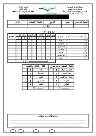 تتعلق الوثيقة بتقييم برنامج إذاعي لطلاب المرحلة الابتدائية في مدرسة المشكاة الأهلية، حيث تحتوي على مكونات مثل الأداء والانضباط والإبداع. يسجل التقييم قوة الأداء والحضور والابتكار، مع إيضاح الدرجات والملحوظات الخاصة بالبرنامج. الوثيقة تتضمن مقياس تقييم لتحسين برامج الإذاعة المدرسية.