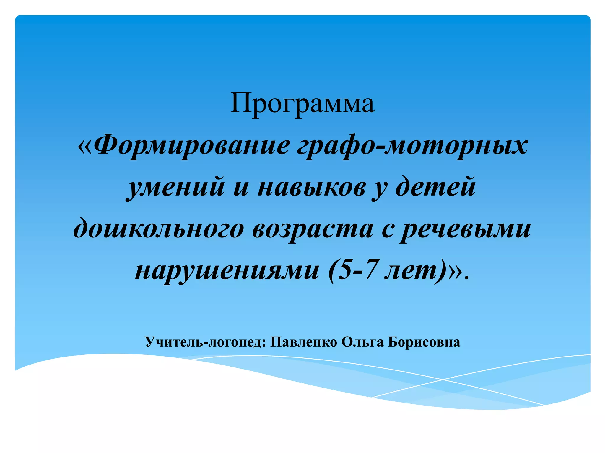 Документ описывает программу формирования графо-моторных умений и навыков у детей дошкольного возраста с речевыми нарушениями. Цель программы — предупреждение нарушений письма и чтения через развитие графо-моторных навыков. Включает задачи по развитию мелкой моторики, зрительно-моторной координации и другие аспекты, а также методы оценки и материалы для занятий.