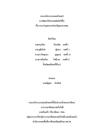 งชาติภูจองนายอย จัดทาโดย นายจารุภัทร หินเกล็ด เลขที่ 1 นายวุฒินันต์ ปุยขาว เลขที่ 3 นางสาววิชญาดา บุญมาก เลขที่ 13 นางสาวอัจฉริยา โพธิ์งาม เลขที่ 17 ชั้นมัธยมศึกษาปี ที่ 6/2 นาเสนอ นายณัฐพล บัวพันธ์ รายงานโครงงานคอมพิวเตอร์ นีเ้ ป็ นส่ วนหนึ่งของการศึกษา การงานอาชีพและเทคโนโลยี ภาคเรียนที่ 2 ปี การศึกษา 2556 กลุ่มสาระการเรียนรู้ การงานอาชีพและเทคโนโลยี (คอมพิวเตอร์ ) สานักงานเขตพืนทีการศึกษามัธยมศึกษา เขต 28 ้ ่