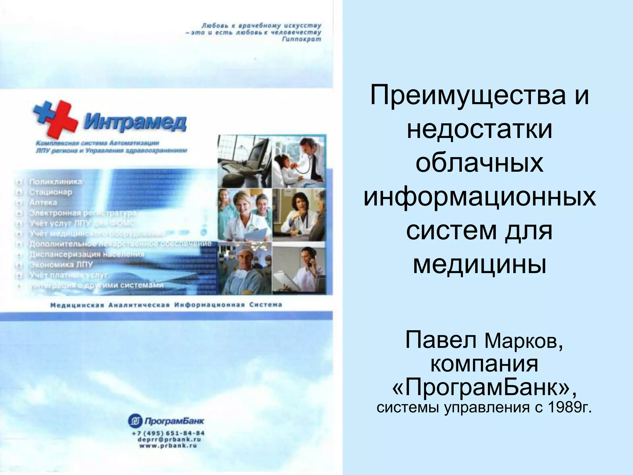 Документ обсуждает преимущества и недостатки облачных информационных систем для медицины, акцентируя внимание на системе «интрамед», которая автоматизирует функции медицинских учреждений и облегчает доступ к информации. Она предлагает дистанционные медицинские услуги и не требует значительных затрат на оборудование и персонал. Система обеспечивает высокий уровень безопасности данных и эффективное управление процессами медорганизации.
