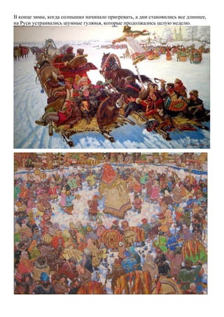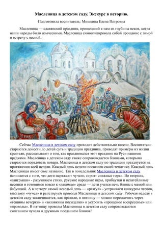 Документ описывает празднование Масленицы в детском саду, акцентируя внимание на традициях и мероприятиях, связанных с этим славянским праздником. Воспитатели обучают детей основам культуры и истории Масленицы, включая изготовление кукол и приготовление блинов. Празднование включает различные themed дни, увлекательные игры и традиционные обряды, приводящие к сжиганию чучела в конце недели.