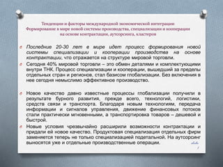 Документ обсуждает тенденции и факторы международной экономической интеграции, подчеркивая важность специализации, кооперации и аутсорсинга в глобальной экономике. Он подробно рассматривает новые роли малого бизнеса и формирование кластеров как ключевых элементов для повышения эффективности производства. В Беларуси подчеркивается необходимость реструктуризации промышленности и создания условий для интеграции в транснациональные сети производственной кооперации.