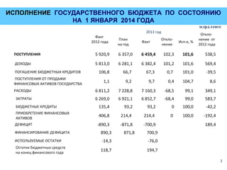 Документ представляет собой отчет Министерства финансов Республики Казахстан о выполнении государственного бюджета на 1 января 2014 года, включая данные о поступлениях, расходах и дефиците бюджета за 2013 год. В нем также обсуждаются результаты исполнения бюджета по регионам и плановые показатели на 2014 год, а также анализируются причины неосвоения средств и изменения в законодательстве о государственных закупках. Кроме того, документ включает информацию о национальном фонде и управлении государственной собственностью.