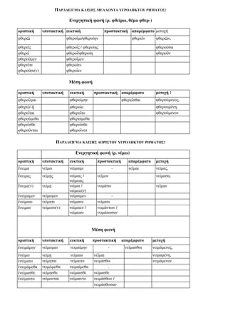 ΥΓΡΟΛΗΚΤΟΥ ΡΗΜΑΤΟΣ: Ενεργητική φωνή (ρ. φθείρω, θέµα φθερ-) οριστική προστακτική απαρέµφατο µετοχή υποτακτική ευκτική φθερ« φθερο›µι/φθεροίην φθερε›ς φθερε› φθερο˵εν φθερε›τε φθεροËσι(ν) φθερε›ν φθερο›ς / φθεροίης φθερο›/φθεροίη φθερο›µεν φθερο›τε φθερο›εν φθερ«ν, φθεροËσα φθεροËν Μέση φωνή οριστική υποτακτική ευκτική φθερο˵αι φθεροίµην φθερε›/-ª φθερε›ται φθερούµεθα φθερε›σθε φθεροËνται προστακτική απαρέµφατο φθερο›ο φθερο›το φθεροίµεθα φθερο›σθε φθερο›ντο φθερε›σθαι µετοχή 1 φθερούµενος, φθερουµένη, φθερούµενον ΠΑΡΑ∆ΕΙΓΜΑ ΚΛΙΣΗΣ ΑΟΡΙΣΤΟΥ ΥΓΡΟΛΗΚΤΟΥ ΡΗΜΑΤΟΣ: Ενεργητική φωνή (ρ. νέµω) οριστική υποτακτική ευκτική ¶νειµα νείµω νείµαιµι ¶νειµας νείµη+ς ¶νειµε(ν) νείµη+ §νείµαµεν §νείµατε ¶νειµαν νείµωµεν νείµητε νείµωσι(ν) νείµαις / νείµειας νείµαι / νείµειε(ν) νείµαιµεν νείµαιτε νείµαιεν / νείµειαν προστακτική - απαρέµφατο µετοχή νε›µαι νείµας, νε›µον νείµασα, νειµάτω νε›µαν - νείµατε νειµάντων / νειµάτωσαν Μέση φωνή οριστική υποτακτική ευκτική §νειµάµην νείµωµαι νειµαίµην §νείµω §νείµατο §νειµάµεθα §νείµασθε §νείµαντο νείµη+ νείµηται νειµώµεθα νείµησθε νείµωνται νείµαιο νείµαιτο νειµαίµεθα νείµαισθε νείµαιντο προστακτική νε›µαι νειµάσθω νείµασθε νειµάσθων / νειµάσθωσαν απαρέµφατο νείµασθαι µετοχή νειµάµενος, νειµαµένη, νειµάµενον
